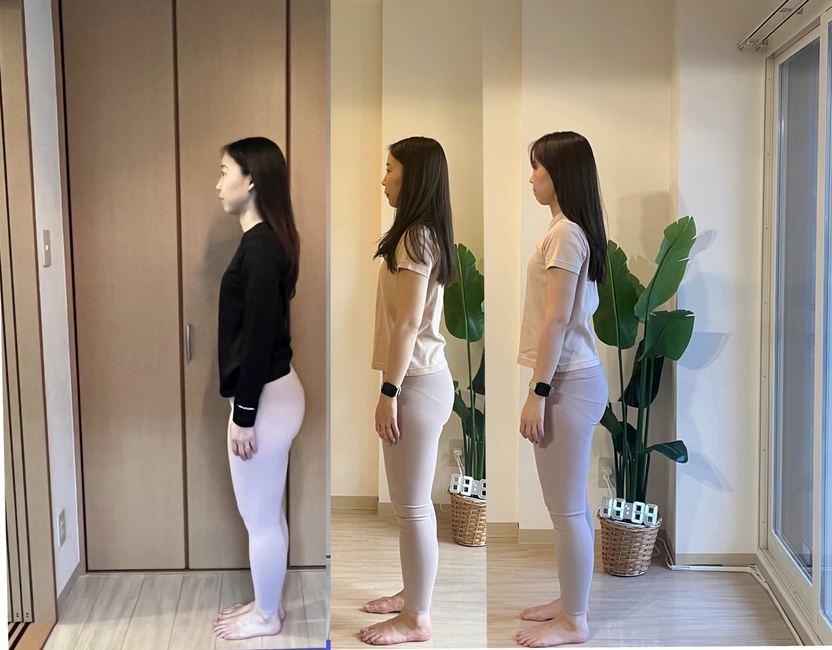 ストレートネックの改善と骨盤の前傾が整い、全体の姿勢ラインが改善。